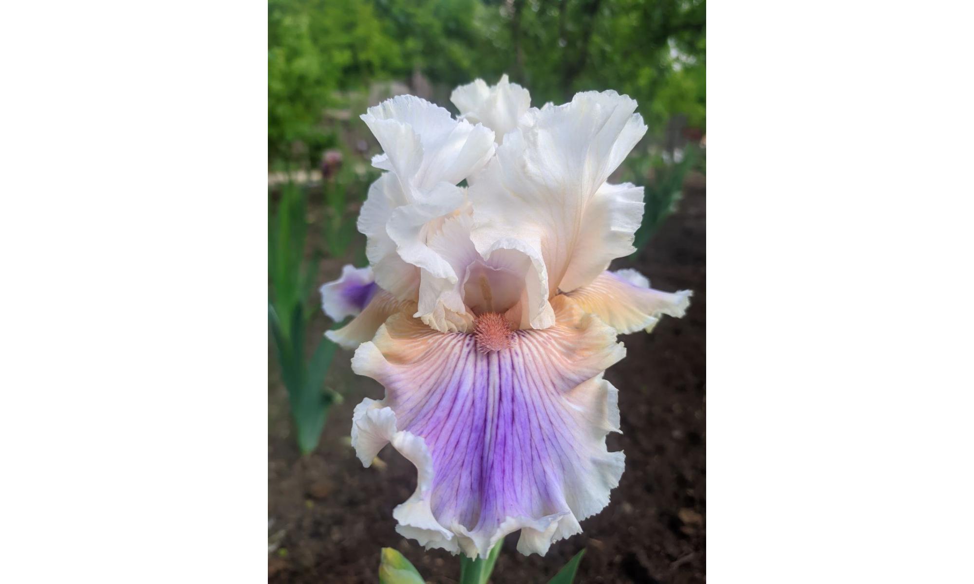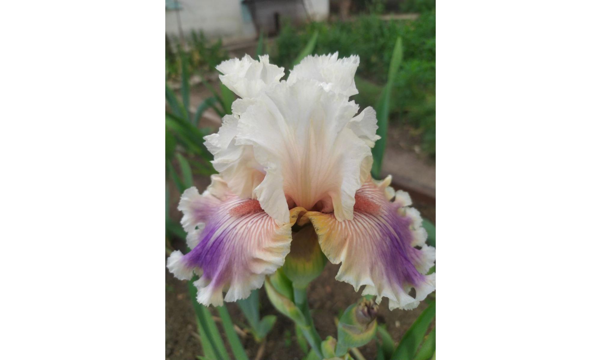 T. JOHNSON-2018. Белые стандарты с легким вливанием кремового в центре, фолы белые с пастельно-оранжевыми плечиками в центе  светло фиолетовое пятно, смотрится очень нарядно. Очень поздний срок цветения.