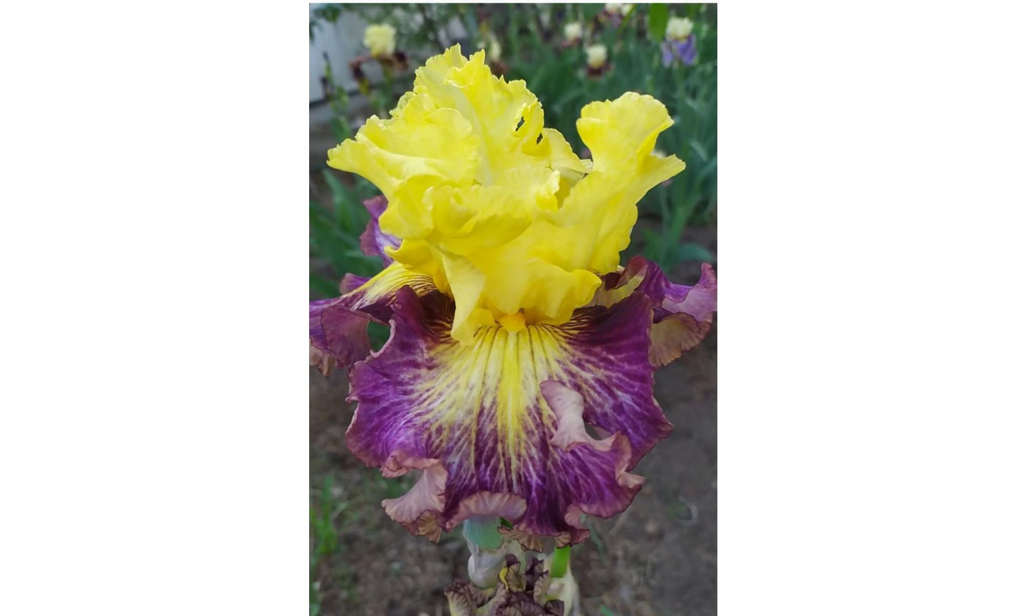 SUTTON - 2017. Стандарты ярко-желтые. Фолы рубиново-фиолетовые с желтым всплеском у основания желтых бородок и светлыми полосами по краям. Гофрированный! Высота до 1,2 м.