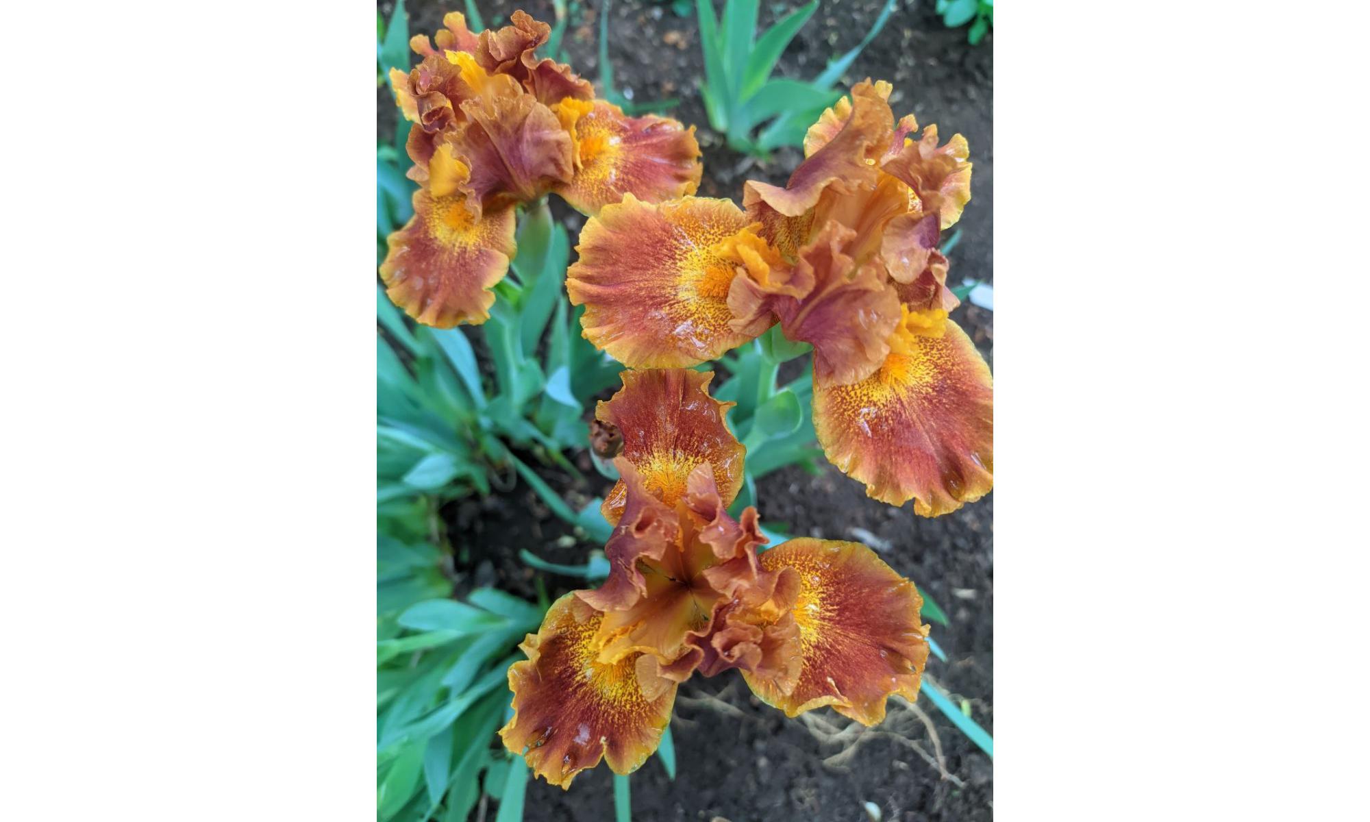 P.BLACK-2015г. Яркий рыже-красный цветок с желтым свечением вокруг ярко-оранжевых бородок. Цветок в саду заметен из далека. Позднее цветение, высота до 30 см.